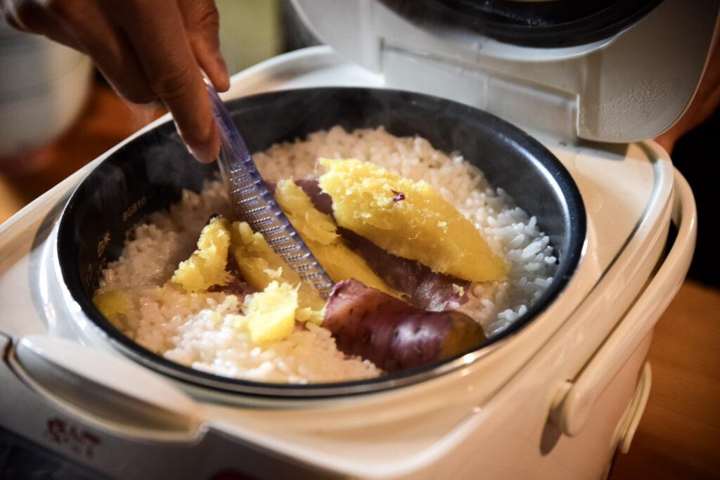 さつまいもはまるごと1本を炊飯器にいれて、ご飯が炊けたらざっくりと混ぜる。